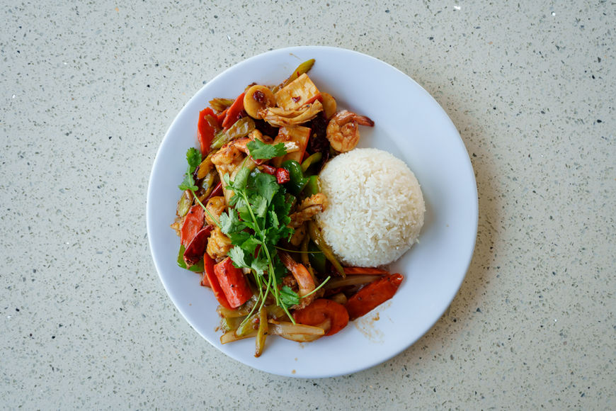 Caramelized shrimp in the traditional clay pot. Served with white rice and veggies on the side